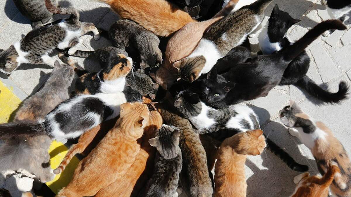 You'll see one cat knock over a domino, another rings a bell . . . one presses a button, and one licks some food off a dish.