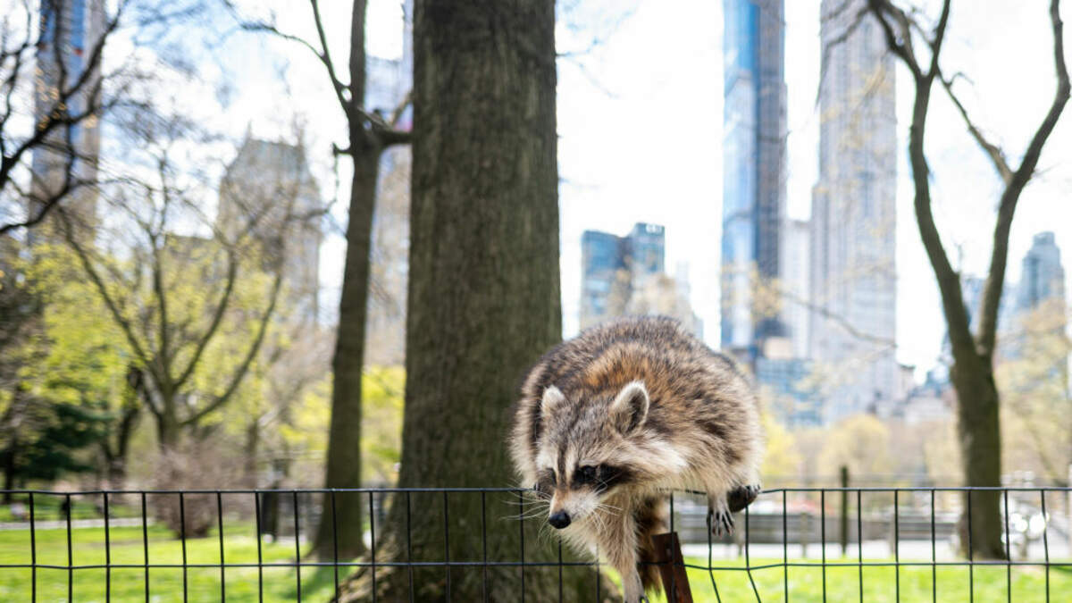 This raccoon walked up and tried to take a cell phone from a backyard table but quickly runs away after accidentally knocking it to the ground.